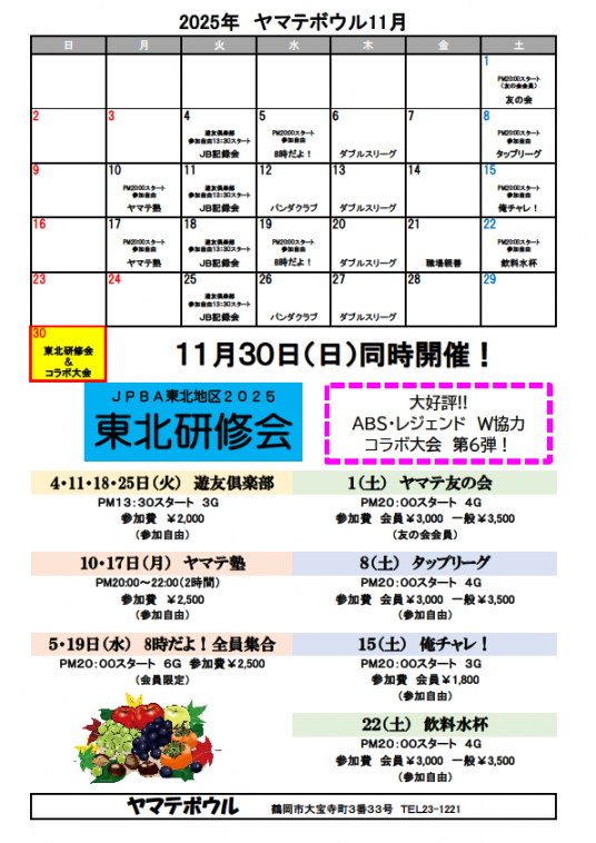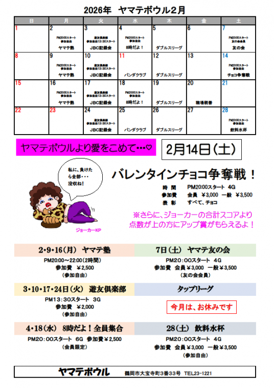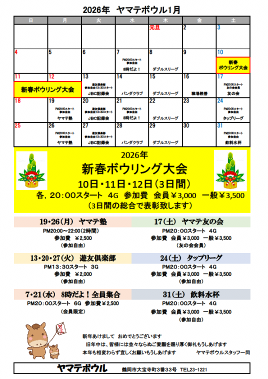 【参加資格】 どなたでも参加できます。 【参加費】 会員3,000円 一般3,500円 【ゲーム数】 4ゲーム 【ハンディキャップ】 オフィシャルハンディキャップ戦もしくは 年齢性別ハンディキャップ 【表彰特典】 優勝~3、5、7、10位 飛び賞 H/G、H/S 飲料・ポイント券 | |